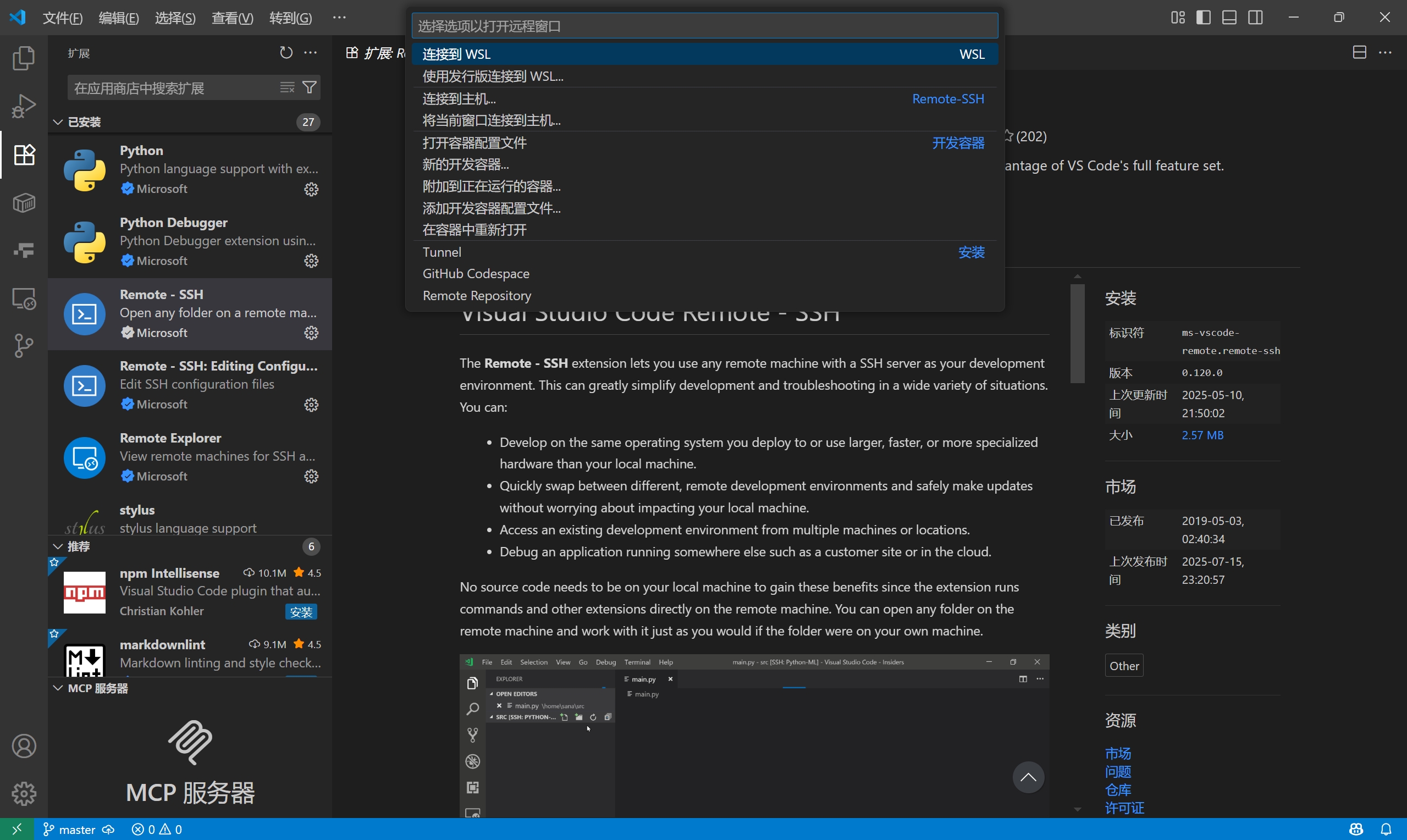 首先在vscode中安装插件Remote - SSH,安装完后后点击左下角的Remote - SSH图标,接着选择链接到WSL, Vscode会自动链接到wsl,无需输入IP和密码